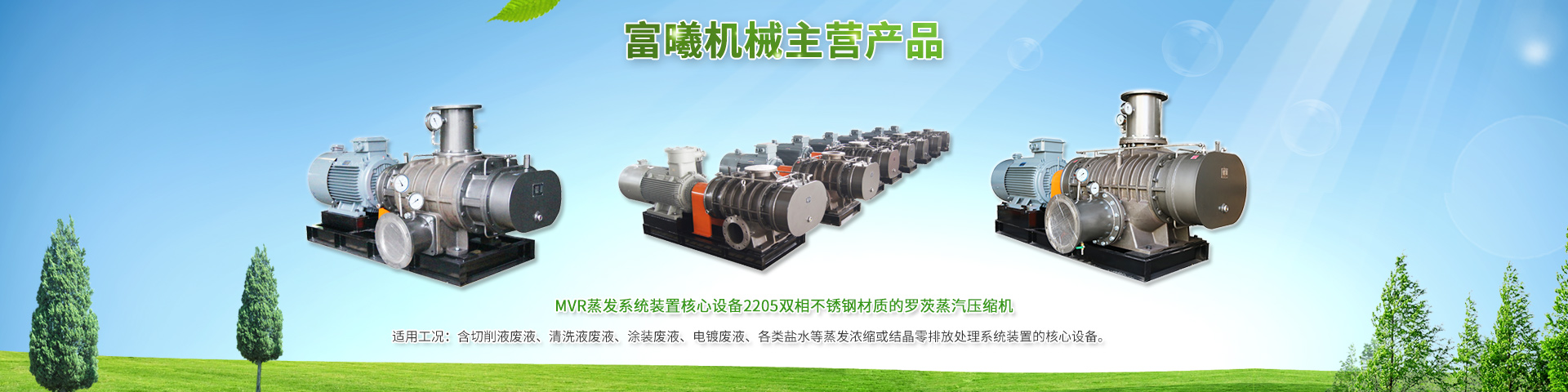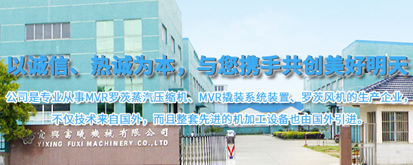 宜兴富曦机械有限公司引进国外技术。公司座落在美丽的太湖西畔、 环保之乡的国家高新技术开发区中国宜兴环保工业园内,占地面积2.2万平方米,建筑面积1.5万平方米,总投资人民币5000万元。注册资本人民币 2580万元。本部员工80多人,其中科技人员18人,外协配套生产企业8家。专业生产MVR核心设备MVR不锈钢罗茨蒸汽压缩机、MVR撬装系统装置、FTB/FMF/FIB系列罗茨风机、负压罗茨风机、特殊罗茨风机等。现公司已形成了年生产销 售各类鼓风机2200多台。产值6000多万元的规模。